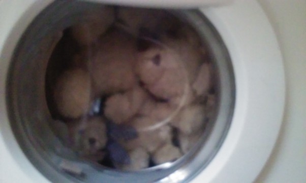 Tata poszedł na strych-znaczy ja mu kazałam bo on sam z siebie raczej nie za bardzo...przyniósł cały wielki worek zabawek pluszowych i co-trzeba było je wyprać. Bo mimo tego że były szczelnie zamknięte to jednak trochę tam przeleżały w oczekiwaniu na kolejne dziecko któremu posłużą i właśnie taki czas nadszedł...teraz się wszystkie piorą by były czyste i pachnące :)