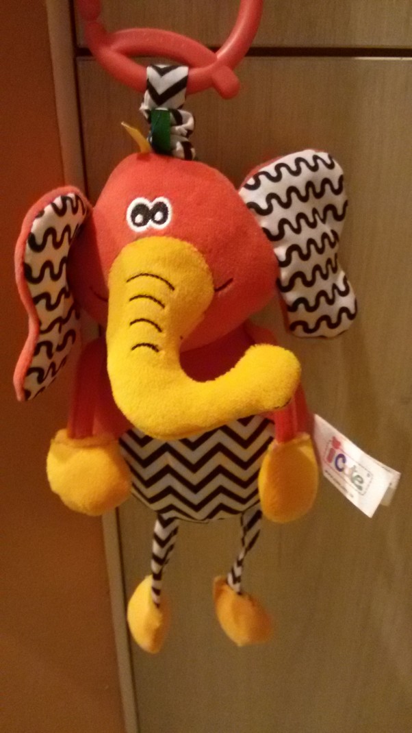 Taki oto prezent Bąbelek dostał od swojego taty;) Słonik brzęczy, wibruje i szeleści. Zamierzam go powiesić w wózeczku (kiedy wreszcie zdecydujemy się na jakiś konkretny model) by zawsze towarzyszył nam na spacerach, kiedy tata będzie w pracy;) To było zaskoczenie również dla mnie i to bardzo miłe;) Myślałam, że tylko przyszłe mamy chodzą na zakupy i robią prezenty przyszłym pociechom;)