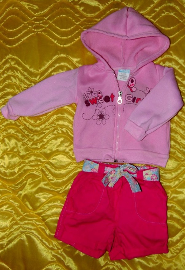Babcia zrobiła wnusi prezent na Dzień Dziecka i kupiła spodenki oraz bluzę. Troszkę większe jak widać, ale Julka do następnego lata akurat podrośnie do tych spodenek ;) mądra babcia hihi :P