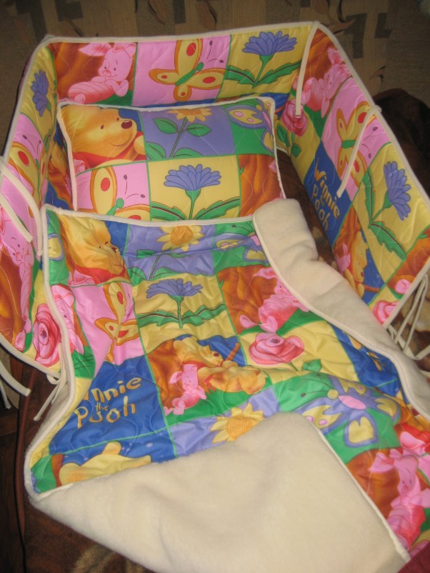 Piekna posciel z owczej welny obszyta kolorowymi motywami z Kubusia Puchatka :D Mysle ze malenstwu napewno sie spodoba a my mamy z glowy dodatkowo materacyk do lozeczka i wozka ktory byl w komplecie :D Cudownie :)