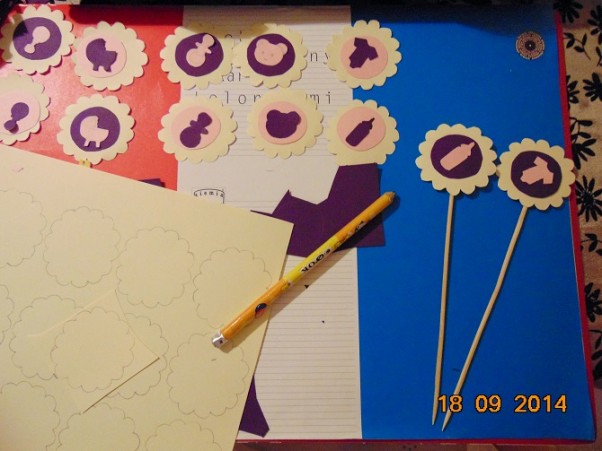 Od paru godzin tworzę, rysuję, wycinam, kleję... przygotowuję się do Baby Shower, które urządzam w sobotę :) To będzie super imprezka z samymi dziewczynami, konkursami i słodkościami na stole :) każda dziewczyna przyniesie jakiś prezencik dla Julci, a nasza wyprawka znów się powiększy :) Na zdjęciu plakietki na patyczkach, które będą włożone w babeczki. Planuję jeszcze zrobić torcik bezowy, sałatkę owocową i karpatkę. A dziewczynom zorganizuję fajne konkursy, np. dam każdej kawałek sznurka i będą musiały przyciąć go tyle ile cm ma mój brzuszek ( ciekawe która będzie najbliżej, bo brzusio ma 89 cm), będzie też malowanie mojego brzucha, księga życzeń dla Julki i inne. Zapowiada się miła sobota w doborowym towarzystwie :)