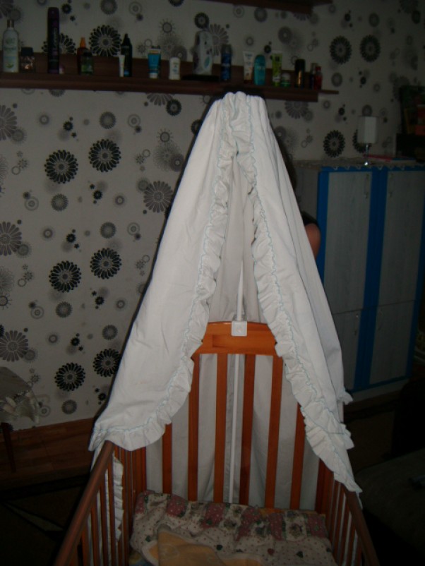 Mama dzisiaj szalała i postanowiła przymierzyć jak będzie wyglądał baldachim przy łóżeczku :) oczywiście jak go wyprasuje i postawi łóżeczko na swoje miejsce będzie wyglądał ślicznie ale ja czuję(po emocjach Mamy),że będzie ładnie...
