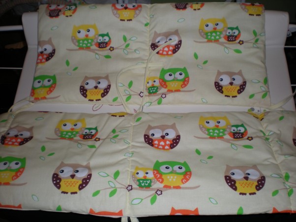 Właśnie dziś skończyłam szycie przepięknych ochraniaczy na łóżeczko mojego maluszka i do kompletu organizer udało mi sie stworzyć :) Wygladają pieknie są uniwersalnego koloru bo zółte/ecri z małymi przesłodkimi zielono-pomarańczowo-brązowymi sówkami, mimo iz ja osobiscie sów takich żywych prawdziwych się boję to te sa przesłodkie. Teraz musze tylko powiedziec męzowi żeby wziął sie za skręcanie łózeczka aby zobaczyć jak sie będą prezentowac w pełnej okazałości