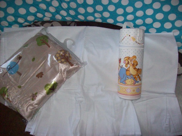 Teściowie nie chcąc być gorsi również sprawili nam niespodziankę.... kupując prześliczny mięciutki kocyk wraz z bawełnianym prześcieradełkiem z falbaną które kolorystycznie pasuje do pościeli :D Dodatkowo kupili termos z Disneya do butelek, który również odciąży Nas z dodatkowych wydatków.