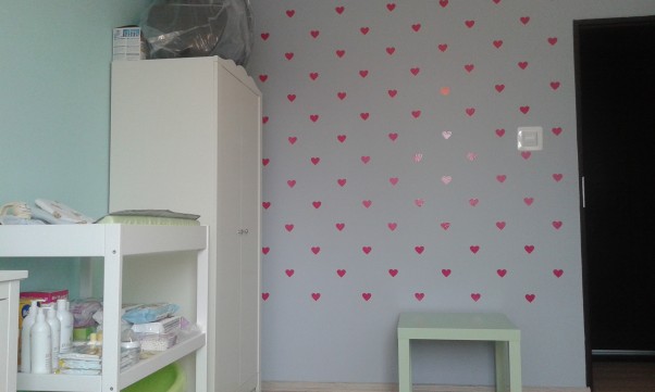 razem z mężem przyklejaliśmy 200 serduszek na ścianę;) zajęło nam to 2,5 godziny przy pomocy poziomicy:) czego się nie robi dla naszego szczęścia;)