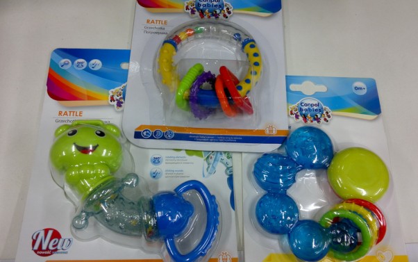Grzechotki różnobarwne, różnokształtne przeznaczone już od pierwszego miesiąca,