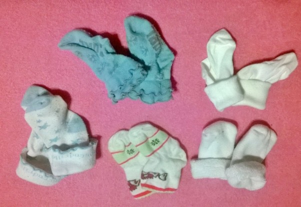 Tak malutkie i słodkie, w tym samym rozmiarze, ale różnej grubości - cieńsze i grubsze, czekają na pranie, które planuję zrobić w siódmym miesiącu ciąży.