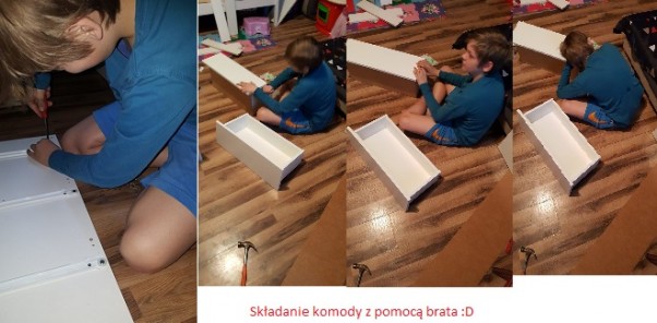mój starszy syn pomagał mi bardzo w składaniu komody choć nie było to łatwe i niestety nie do końca nam się udało bo dwie szuflady jakoś nie pasują do całości dlatego dzisiaj czekamy na fachowca który to wszystko dopasuje...