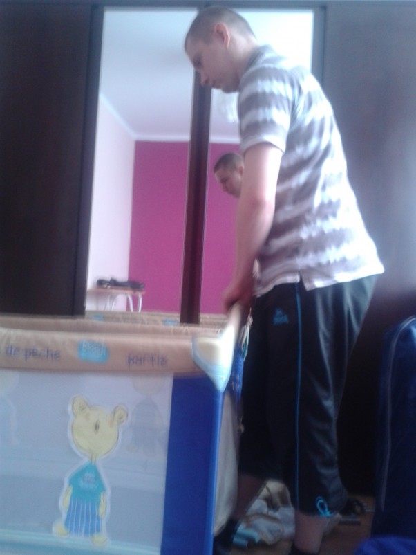 A tak mąż rozkładał łóżeczko :) Przy turystycznym dużo pracy nie ma :) wystarczy mocno i stanowczo pociągnąć boki :)
