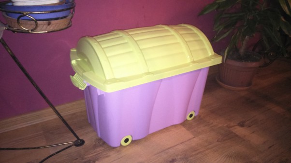 Mam też swoją Skrzyneczke Na zabawki ja mam zielono fioletowa, a mój braciszek ma czerwono-niebieska. Ale Tomusia zabawki wszystkie nie mieszczą się do skrzynki, bo ma ich bardzo dużo.