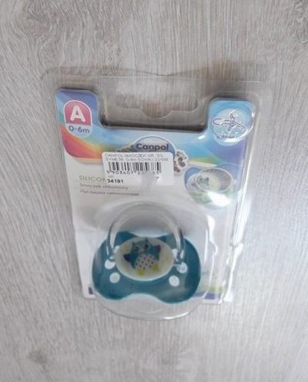 Smoczek z sówką z Canpola ze świecącym w ciemności uchwytem co pomaga go w znalezieniu w nocy :) Jeszcze na pewno na późniejszy okres kupię smoczki z Lovi, te które są w dwupaku bo przy Julusi nam się sprawdziły :)