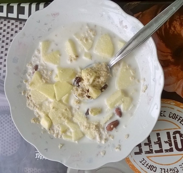 Dziś na śniadanie mieliśmy owsiankę na mleku z jabłkami i migdałami.