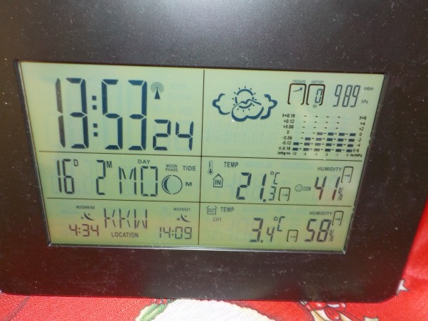 Ostatnio często w nocy nie mogłam spać, usta popękane i w nosie sucho. Postanowiliśmy więc kupić stację pogodową, która będzie nam podawać temperaturę na zewnątrz i w pokoju oraz wilgotność zarówno na zewnątrz jak i w domu. Przy okazji podaje też ciśnienie i godzinę wschodu i zachodu słońca ;-)