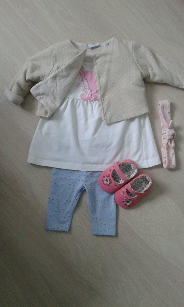 w mojej kolejnej stylizacji udało mi się dopasować tak wszystko by miało ręce i nogi:)) Letnia biała ,bawełniana sukieneczka, przesłodkie leginsy , różowe buciki i kurteczka beżowa w białe grochy:)