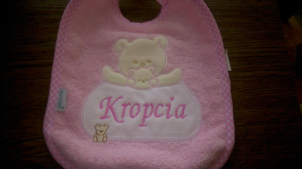 Na suszarce do bielizny przeważają ciuszki maleństwa, maleńkie skarpeteczki, łapki niedrapki, pajace i sukienki :) Słodki widok. A jeszcze słodszy to widok pierwszego prezentu dla naszej córeczki od cioci Izy. Różowy śliniak z napisem Kropcia napis oryginalny ponieważ jak się dowiedziałam że jestem w ciąży poszłam do ginekologa i pierwsze zdjęcie usg to była taka mała kropcia, moja mała kropcia najśliczniejsza kropcia, kropeczka na świecie i tak mijają tygodnie ciąży moja kropcia, to już fajna dziewczynka i już nie przypomina mojej kropeczki, ale wszyscy z rodziny pytają jak się czuje kropcia bo to nasza kochana maleńka kropeczka słodka i ma swój oryginalny prezent.