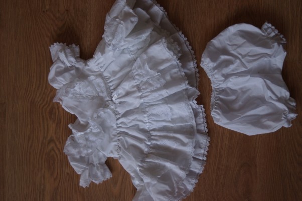 jak na księżniczkę przystało masz sukienkę godną właśnie takiej osobistości :) śliczna biała z mnóstwem koronek...i majtami do tego :) będziesz wyglądać jak mała księżniczka jeszcze tylko korona...piękna :D