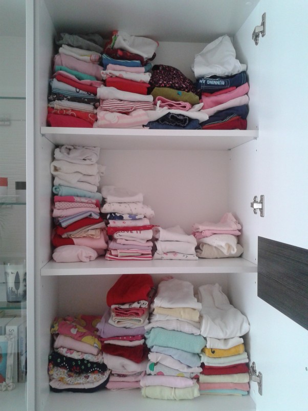Dzięki temu, że zmobilizowałam się do prania i prasowania mam już przygotowaną szafeczkę Oli :) Dwie dolne półki to ubranka z przedziału 0-3 a górna zawiera te z 3-6. Większe ubranka schowałam do oddzielnej szafki, aby mi się nie mieszały. Dzięki tym porządkom wiem jakiego rodzaju ubranek mi jeszcze brakuje i jakie muszę dokupić.