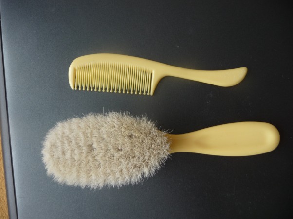 Szczotka przyda się na pewno kiedy maluszek będzie mieć króciutkie włoski. Grzebień wykorzystam, kiedy włoski będą zdecydowanie dłuższe. Zestaw ten pozwoli mi dbać o rozczesanie włosów i ułożenie fryzurki.