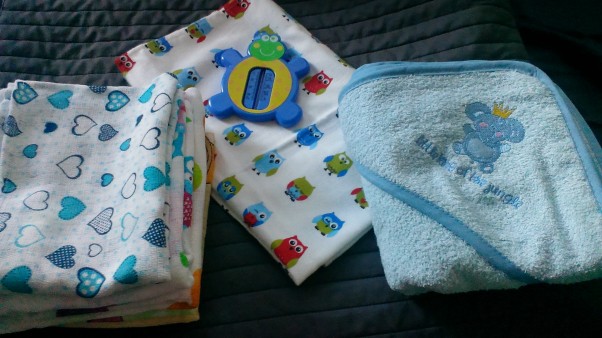 nie moglam sie powstrzymac i bedac z mężem w sklepie kupilismy po raz kolejny kolorowe pieluszki tetrowe i jedna flanelowa w sówki, przepiekna :), kolejne okrycie kapielowe oraz sliczny termometr w kszlatcie żółwika :)