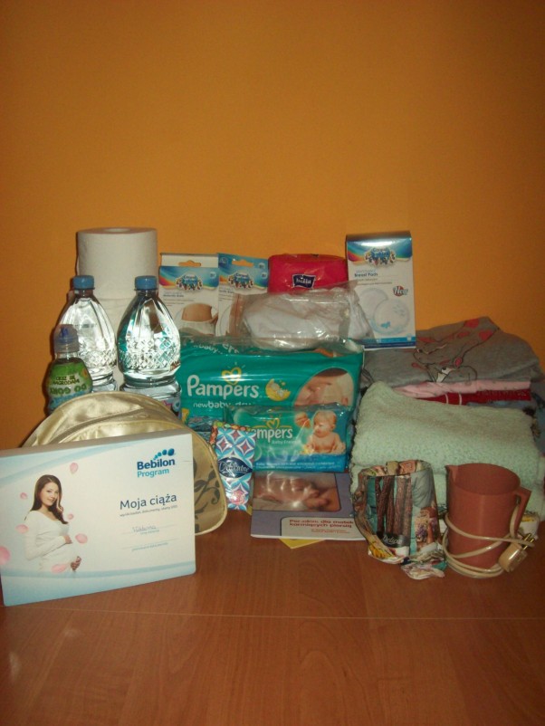 Na szczęście szpital mój nie oczekuje, iż przywiozę ubrania dla noworodka, czy kosmetyki dla niego. :)) Torba i tak jest pełna. A oto co się w niej znajduje.