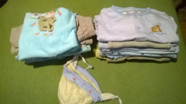 Przygotowane do prania i prasowania ciuszki dla spodziewanego chłopca. Nie tylko ja cieszyłam się, gdy je przeglądałam, starszy brat i siostra również, a na dodatek wybierali i polecali mi te najładniejsze. Oto ich typy.