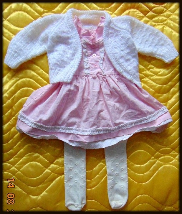 Po wizycie u ginekologa poszłam do dwóch lumpków i w nich wynalazłam kolejne ubranka dla Julci :) A ten śnieżno-biały sweterek, różowa sukieneczka i beżowe rajstopki przeplatane złotą nitką wyglądają razem bosko. Już widzę Julkę w tych ubrankach, jak MAŁA LALECZKA! :*