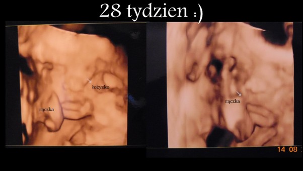 Dzisiaj byłyśmy na usg 4D, oczywiście malutka nie chciała się pokazać w całości, jedną stronę buźki miała przy łożysku a drugą zakryła rączką. Ginekolog próbował się wcisnąć między rączkę a łożysko, ale bardzo mało było widać. Na szczęście pan doktor pozwolił nam przyjść za 2 tygodnie w cenie tej samej wizyty i wtedy spróbujemy jeszcze raz :) Rybka waży 1025 gram :) Jak ja się cieszę że Julka ma nosek po mamusi hihi :) mój skarb kochany <3