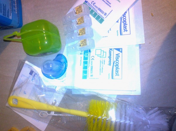 Kupiłam kilkanaście ampułek soli fizjologicznej która jest bardzo przydatna przy przemywaniu oczek maleństwa, oraz do nawilżania śluzówek nosa. Dodatkowo kupiłam troszkę gazików które przydadzą się do przemywania buźki i jamy ustnej bobasa. A dodatkowo kupiłam szczotkę do mycia butelek i pojemnik na smoczek były w aptece na wierzchu to za pamięci kupiłam i od razu wykreśliłam z listy zakupów.