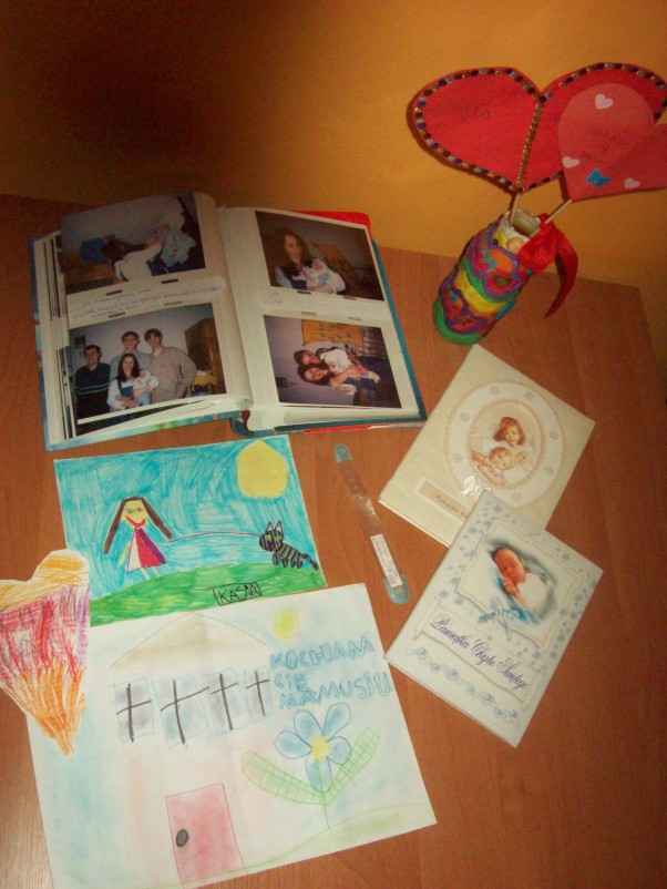 Album ze zdjęciami z pierwszych dni jej życia, opaska, którą miała na rączce w szpitalu, wykonany przez nią dzbanek na kwiatki dla mnie i serducha, które dostałam na Dzień Mamy, pamiątki chrztu i jej rysunki z czasów przedszkolnych. Trafiła się nam wspaniała okazja, aby razem powspominać, a nasza starsza córeczka miała przyjemność, w tym całym zamieszaniu związanym z przyjściem na świat jej siostry, poczuć się w końcu ważna i zauważona. :))