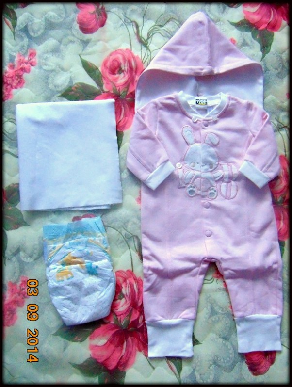 Prababcia Marysia przyszła dziś do nas na kawkę i kupiła prawnusi ubranko z odpinanym kapturkiem, podkład do przewijania i pampersika. Wyprawka się powiększa powoli :)