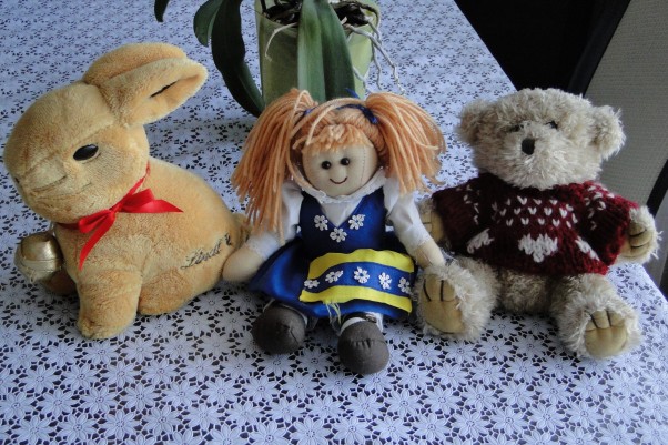 Lubimy z mężem podróżować z każdej wyprawy przywozimy pamiątki. Te ze zdjęcia wydawały mi się najmniej udane... po co nam pluszaki?-myślałam i tak leżały sobie na dnie szafy razem z zimowymi czapkami i szalami. Teraz je wyjęłam, wypiorę i będą ozdabiać pokój naszego maluszka. Miś jest z Anglii ze sklepu z misiami:) Zajączka dostałam na naszą pierwszą wspólną Wielkanoc. To na pewno się przyda a jak będzie dziewczynka to lalka ze Szwecji też do nich dołączy.
