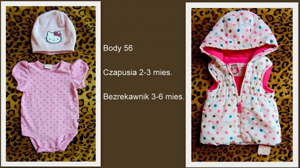 Babcia wyszukała wnusi czpeczkę z Hello Kitty, a ja wyjątkowo zadbane body na 56 i nowiutki bezrękawnik jeszcze z metką, więc mam pewność że nikt go nie nosił.