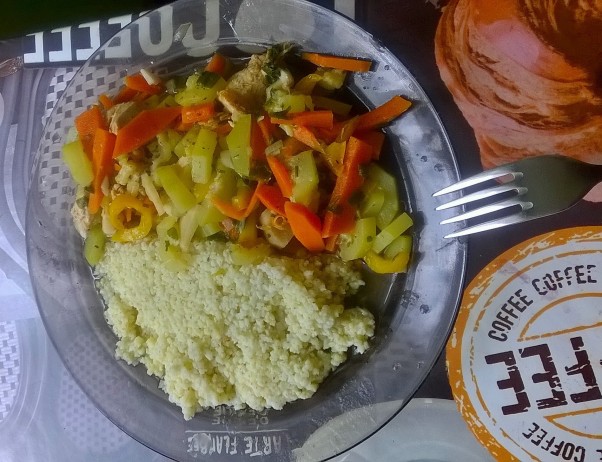 Rybka duszona z warzywami: marchewką, papryką i cukinią podana z pożywną kaszą kuskus.