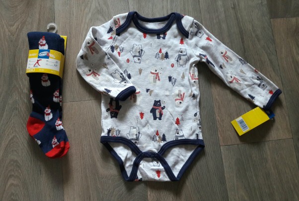 Typowo zimowe ubranka bo w bałwanki. Kupilam body i rajstopki w rozmiarze 74, ciekawe kiedy je ubierze :)