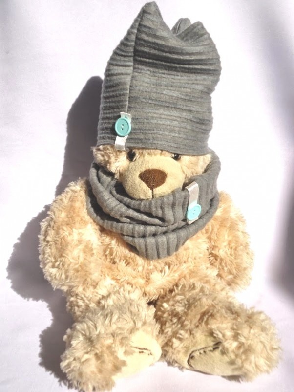 Z racji, że nasz synuś urodzić się ma na późną jesień, uszyłam (z zakupionego w lumpku szalika) zestaw czapeczki i komina w szarości z fascynującą mnie miętą. Zimno nie będzie nam już straszne. Komplecik jest mięciutki i taki słodko maluśki. Jak na razie zaprezentowany na misiu. Mała rzecz, a CIESZY!!!